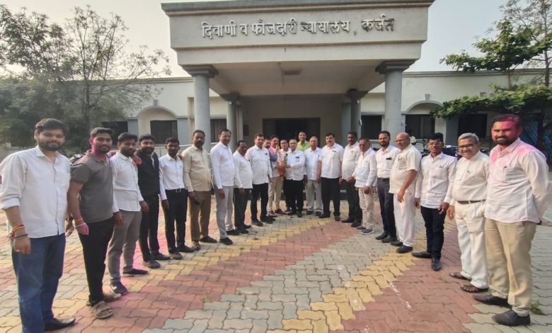 निवडणुकीचा निकाल जाहीर झाल्यानंतर कर्जत न्यायालय परिसरात सर्वच वकील सदस्यांनी एकत्र येत मोठा विजयोत्सव साजरा केला. फटाक्यांची आतिषबाजी आणि गुलालाची उधळण करत नवनिर्वाचित अध्यक्षांचे स्वागत करण्यात आले. यावेळी तालुक्यातील ज्येष्ठ वकिलांसह सर्व सदस्यांनी नवनिर्वाचित अध्यक्ष ॲड. संग्राम ढेरे व त्यांच्या संपूर्ण कार्यकारिणीचे पुष्पगुच्छ देऊन अभिनंदन केले. वकील संघाच्या हितासाठी आणि वकिलांच्या विविध प्रश्नांवर ही नवीन कार्यकारिणी जोमाने काम करेल, असा विश्वास यावेळी व्यक्त करण्यात आला…